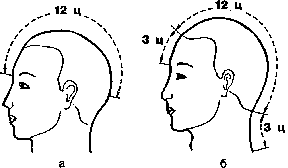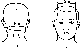 На голове расстояние от передней границы волосистой части до задней границы равняется 12 пропорциональным цуням. Если передняя граница волосистой части головы не выражена, то измерение начинается от надпереносья вверх до предполагаемой передней границы волосистой части головы; это расстояние равняется 3 цуням. Если задняя граница волосистой части головы выражена плохо, то измерение начинается от точки VG14 вверх до предполагаемой задней границы волосистой части головы, это расстояние тоже равняется 3 цунь. При плохо выраженных передней и задней границах волосистой части головы надо помнить, что расстояние от надпереносья до точки VG14 равняется 18 цунь (Чжу Лянь, 1959) (Рис. 23).