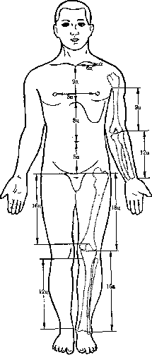 Существует методика измерения с помощью пропорционального цуня. Что это такое? Это деление определенного расстояния на несколько частей, каждая из которых расценивается как один пропорциональный цунь, независимо от роста и возраста больного. Например, расстояние от точки (14VG) до точки 2VG, расположенных на спине, считалось равным 30 пропорциональным цуням, а на животе расстояние от пупка до верхнего края лобковой кости - 5 пропорциональным цуням.
