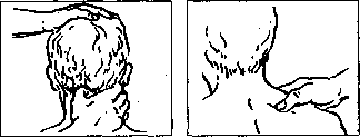 Защипывают подлежащие мышцы первым и вторым (иногда пятью) пальцами в области точки с довольно-таки сильным давлением до получения выраженной гиперемии, но не очень болезненным, что соответствует седативному методу. Например, при головной боли двумя пальцами защипывают точку РС3между бровями, или обе точки V10 пятью пальцами (Рис. 26).