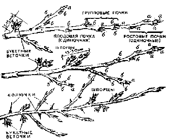 На рисунках: сверху - плодоношение на однолетних приростах (первая группа сортов); в центре - плодоношение на букетных веточках и шпорцах (вторая группа сортов); внизу - плодоношение на однолетних приростах, букетных веточках и шпорцах (третья группа сортов). |