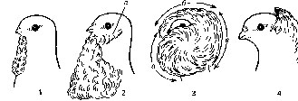 7. Перьевые украшения на шее: 1 - манишка ("бант"); 2 - жабо ("подушка") и воротничок (а) у китайских чаек; 3 - парик-мех (о), шапка (б), грива (в); 4 - грива.