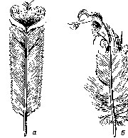 а - конец опахала рулевых перьев расщеплен ("кружева", "бахрома"); б-у мелких перьев на щитках и на теле опахала в форме локона как бы завитое или расщепленное ("курчавое").
