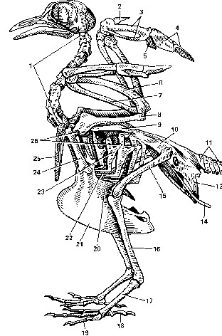 1 - шейные позвонки; 2 - первый палец на крыле; 3 - пясть; 4 - второй палец; 5 - третий палец; 6 - локтевая кость; 7 - лучевая кость; 8 - плечо; 9 - лопатка; 10 - подвздошная кость; 11 - хвостовые позвонки; 12 - копчиковая кость; 13 - седалищная кость; 14-лонная кость; 15-бедро; 16-голень; 17-цевка (плюсна); 18-первый палец на ноге; 19- четвертый палец на ноге; 20- грудина; 21 - киль грудины;22 - брюшная часть ребра; 23 - спинная часть ребра; 24 - коракоид; 25 - ключица; 26 - грудные позвонки.