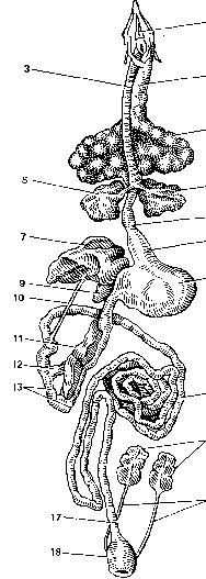 3. Внутренние органы голубя: 1 - язык; 2 - пищевод; 3 - трахея; 4 - зоб; 5 - легкие; 6 - железистый желудок; 7 - печень; 8 - мышечный желудок; 9 - селезенка; 10 - проток печени; 11 -поджелудочная железа; 12 - протоки поджелудочной железы; 13 - двенадцатиперстная кишка; 14 - тонкий кишечник; 15 - почки; 16 - мочеточник; 17 - прямая кишка; 18 - клоака.