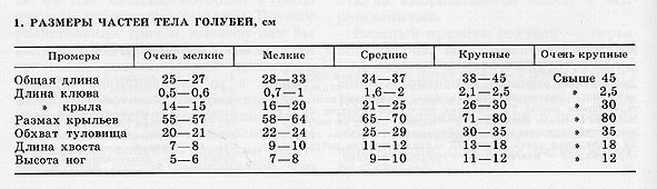 При внешнем осмотре определяют величину голубя, крепость его костяка, телосложение. Одна из особенностей экстерьера - величина голубя. Голуби разных пород имеют различные размеры тела и оперение. Для удобства обращения и описания пород голубей, оценки на выставках и конкурсах условно приняты следующие размеры (табл. 1).