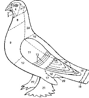 1 - лоб ("кокарда"); 2 - подклювье ("бородка"); 3-горло ("борода"); 4- щеки; 5 - брови; 6 - теменная полоса; 7 - околоушная часть ("сережки"); 8 - шея; 9 - грудь; 10 - спина; 11 - кроющие перья крыла ("щиток" ); 12 - брюшко; 13 - пояса; 14 - надхвостье; 15 - первостепенные маховые первого порядка; 16 - второстепенные маховые второго порядка; 17-ястребиные перья ("откос"); 18 - рулевые хвоста ("хвост); 19-лента; 20-подхвостье ("клин"); 21 - космы; 22 - чулочки; 23 - грива.