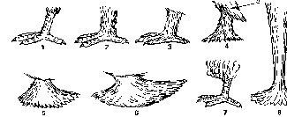 1 - неоперенная нога; 2 - плюсна оперенная, пальцы неоперенные ("в штанишках" ); 3 - плюсна и пальцы оперены короткими перьями (0,5- 1 см) ("в чулках"); 4 - плюсна и пальцы оперены перьями длиной 2-3 см ("чулки в колокольчик"); 5 - плюсна и пальцы оперены перьями длиной 4-6 см ("малые космы"); 6 - плюсна и пальцы оперены перьями длиной 7-10 см и более ("космы в тарелку"); 7 - на голени и брюшке торчащие мелкие перья ("штанишки" или "шорты") у китайских чаек; 8-плюсна и пальцы коротко оперены перьями длиной 2-3 см ("чулки в блюдце") у английских дутышей; а-ястребиные перья.