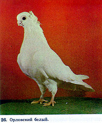 Орловские белые (рис. 26). Точных данных о происхождении этих птиц нет. Однако известно, что они относятся к одной из самых ранних пород русских турманов. Эта порода была использована в XVII и XVIII вв. для создания орловского бородуна и ржевского красно-пегого ленточного. Благодаря красоте тела и белоснежному оперению с чубчиком на голове птицы этой породы нашли почитателей во многих городах России (Белеве, Калуге, Москве, Мценске, Орле, Рыбинске, Туле, Тамбове и др.).