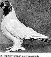 Прибалтийские цветноголовые (рис. 32). Это одна из пород короткоклювых турманов с привлекательным внешним видом. Маленькие голуби вообще очень популярны в Каунасе и в других городах Литвы. Голова относительно крупная, кубической формы. Лоб широкий, высокий, круто поставленный. На затылке широкий чуб от уха до уха. Клюв очень короткий, толстый, белый, восковица маленькая, белая. Глаза большие, выпуклые, радужная оболочка светлая (перламутровая), зрачок темный, веки средние светлые. Шея короткая, сильная, толстая и слегка изогнута. Грудь широкая, округленная, выдающаяся вперед. Крылья средней длины, неплотно прилегающие к туловищу, концы их лежат на хвосте. Хвост средней длины, плотно сомкнутый. Ноги короткие, сильно оперенные. Основное оперение кенигсбергских цветноголовых белое. Голова, передняя часть чуба, подклювье, горло и хвост цветные.