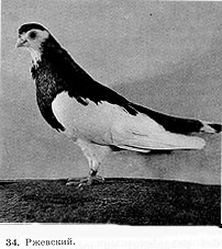 Ржевские (рис. 34). Голубей с красной грудью и приподнятым красным хвостом с белой поперечной полосой (лентой), опущенными крыльями вывели любители Ржева в XVII в. Экземпляры ржевских голубей встречают и в настоящее время. В немецкой литературе XIX и начала XX в. их называли ржевскими сорочьими, звезднохвостыми катунами. Птицы средней величины, стройные, с низкой посадкой и всегда неоперенными ногами. Голова округлая, сухая, лоб широкий, высокий и крутой. Глаза темные, большие, выразительные; веки белые, гладкие и довольно широкие. Клюв бело-телесного цвета, короткий, толстый и тупой, немного опущен книзу; восковица небольшая, овальная и гладкая. Шея относительно длинная, стройная, непосредственно у головы тонкая, затылок округленный, вертикальный. Грудь широкая, округленная, выпуклая. Спина длинная, по направлению к хвосту снижающаяся. Крылья длинные, их концы находятся ниже хвоста, но земли не касаются. Хвост длинный, слегка приподнятый и немного расправленный. Количество перьев в нем от 12 до 16. Ноги короткие, сильные, кораллово-красные, без перьев. Оперение гладкое, плотно прилегающее к телу, темно- или светло-красное (темно-красный цвет предпочтителен). Окраска птиц похожа на окраску сорок, то есть брови, щеки, подклювье, горло (борода), живот, ноги и крылья белые, остальное оперение коричнево-красное темных или светлых оттенков. Через хвост проходит белая лента, окончание хвоста красное.