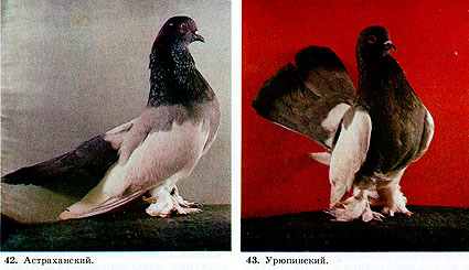 Астраханские (рис. 42). Разводят этих голубей в городах по берегам Волги от Астрахани до Ярославля и в городах Центральной России. Голуби хорошо летают, плодовиты. Полет их продолжительный - 3-6 ч, высотный, круговой. Эти статные голуби с длинным хвостом и крыльями, очень эффектно воспринимаются зрительно. По своей величине они ближе к крупным голубям. Туловище незначительно удлиненное, стройное, крепкое. Удлиненные, крупные перья хвоста и маховые перья крыльев создают впечатление крупного, сильного летуна с элегантным телосложением (длина птиц 35-38 см). Голова овальная, слегка удлиненная гладкая (без чуба), лоб низкий, узкий. Глаза крупные, радужная оболочка светлая, зрачок темный, веки серовато-телесного цвета, узкие. Клюв средней длины, темный, хорошо сомкнутый, восковица слабо развита, плотно прилегает к клюву, белая, гладкая. Верхняя часть шеи тонкая, постепенно утолщается к плечам, слегка изогнута, иногда голуби ею трясут. Грудь широкая, выпуклая. Спина довольно длинная, незначительно покатая к хвосту. Крылья длинные, концы их опущены ниже хвоста и почти касаются земли (вислокрылость), неплотно прилегают к туловищу. Хвост широкий, плоский, из 14-20 широких и длинных рулевых перьев, незначительно приподнят, по его концу проходит темно-синяя лента. Ноги низкие, оперенные (в чулочках), концы пальцев красные, когти белые. Оперение плотное, хорошо прилегающее к телу. Окраска оперения сине-белая, рисунок сорочий. Голова, шея, грудь, спина и хвост синие, щитки крыльев, все маховые перья, живот и ноги белые, часть шеи, груди и поперечная лента на конце хвоста темно-сизые. Предпочтение отдается светло-синим (голубым) тонам. На шее и груди сине-фиолетовый металлический отлив.