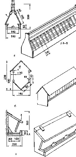 Корм для голубей кладут в специальные кормушки (рис. 136, о, б). Применяются кормушки-автоматы, их используют обычно в период выкармливания птенцов мясных голубей (промышленных). Минеральные корма кладут в отдельные кормушки (рис. 136, в). Количество или величина кормушек зависит от количества голубей.