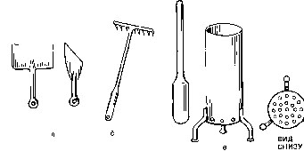 Для уборки питомника голубевод должен иметь лопату, грабли, метлу, ведро, веник, скребки, совок, маленькие грабельки, бидон или канистру для питьевой воды, ступку для приготовления минеральных кормов и редкое сито для просева песка (рис. 139).