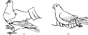 В питомнике каждый голубь должен иметь свое место для сидения и создания гнезда в период кладки яиц и выведения птенцов (рис. 130). Для этого оборудуют специальные насесты и места для гнезд с учетом породы голубей. В качестве насестов могут служить бруски сечением 2-4 см, подвешенные на расстоянии 30- 40 см от потолка, бортики у полки из рейки толщиной 2-2,5 см или специальные сидения на стенах питомника. Насесты необходимы для птиц с сильно оперенными ногами или опущенными крыльями (вислокрылые), чтобы у них не пачкалось и не портилось оперение (рис. 131).