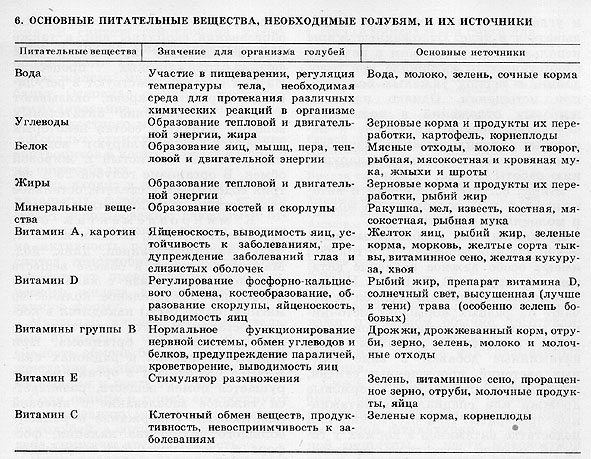 Витамины. Это необходимые жизненно важные вещества. Для голубей имеют особо важное значение витамины А, группы В, С, В, Е и К. При свободном содержании голуби получают из разных кормовых источников почти все витамины. При вольерном содержании голубям дают витаминные добавки в виде зеленых растений, проращенные семена, корнеплоды, рыбий жир, кормовые дрожжи или специальные витаминные препараты. При отсутствии или недостатке витаминов в кормах у голубей обычно возникают заболевания - авитаминоз, гиповитаминоз. У голубей потребность в витаминах зависит от массы тела, состояния здоровья, количества выполняемых физических нагрузок (спортивные и высоколетные), а также от физиологического состояния в определенные жизненные этапы: яйцеобразование, высиживание, кормление птенцов, линька и рост. Спортивным голубям рекомендуется давать поливитамины в форме драже или растворенные в питьевой воде до и после соревнований.