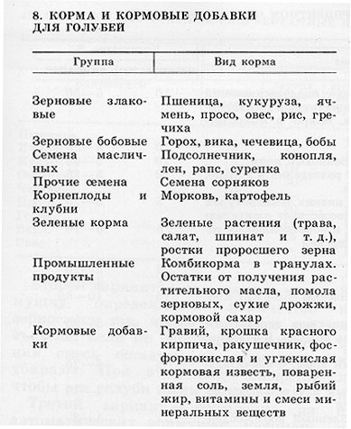Кормовые средства. Домашние голуби типично зерноядные птицы. Их корм в основном состоит из зерна злаковых, семян стручковых и масличных культур, а также некоторых органических, минеральных добавок и витаминов. У свободно летающих голубей добавляются к рациону семена сорняков и культурных растений, частицы травы и листьев, насекомые, черви, а также ягоды.