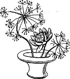 Стебель укропа согнуть у самого соцветия и незаметно закрепить проволокой. Установить в вазу крестовину и расположить на ней соцветие укропа и георгин (рис. 126).