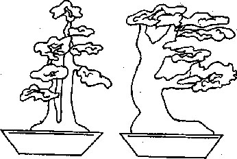6. Бундзинги (рис. 143) - сложный в исполнении элитарный стиль бонсаи, при котором стройное дерево имеет лишь небольшую крону с немногочисленными листьями. Это один из старейших стилей, начало которому положили философы, живописцы, литераторы. Они не соблюдали правил, предписанных для бонеаи, и проявляли полную творческую свободу самовыражения.