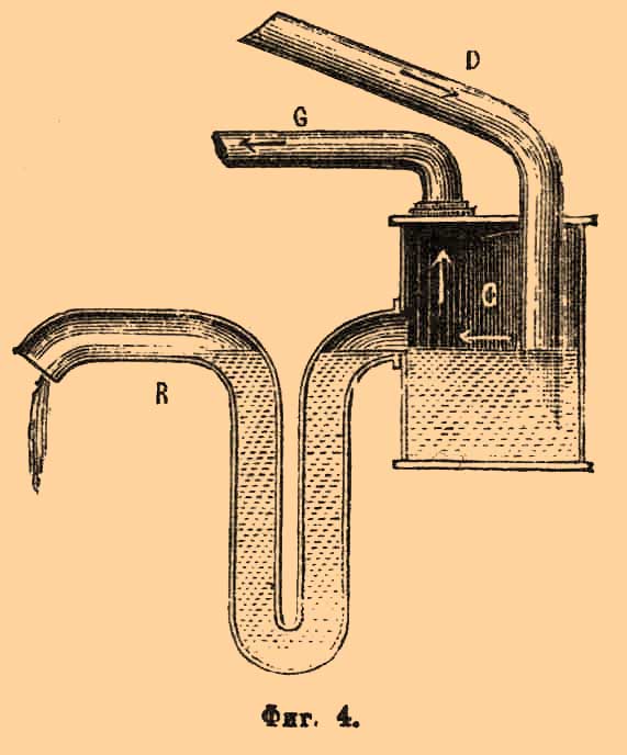 На фиг. 1 при вертикальной реторте представлен холодильник особого типа, предложенный Кирпичниковым и встречающийся на наших заводах. Он состоит из 2 труб большого диаметра, закрытых по концам и соединенных между собой несколькими трубками малого диаметра. Вся эта система труб помещается в деревянном чане с водой. Пары поступают в верхнюю трубу, из которой по тонким соединительным трубкам переходят в нижнюю, а из последней сгустившаяся жидкость стекает по отводной трубке в приемник. Холодильные трубы лучше всего употреблять медные. Длина их должна быть очень значительна, напр. для нескольких реторт общей вместимости в 18-20 куб. м; холодильные трубы должны иметь, по Бершу, до 40 м длины при диаметре в 15 см. Обыкновенно близ выходного конца холодильной трубы вставляют в нее вертикальную открытую трубку для отвода выделяющихся вместе с дистиллятом газов. Если эти газы утилизируются для нагревания реторт, то конец холодильной трубки должен быть вставлен в закрытый сосуд так, чтобы он был погружен несколько в жидкость для образования гидравлического запора, необходимого в том случае, если газы прямо отводятся в топку [Это необходимо для устранения взрыва газов в аппарате, так как огонь может передаться из топки в перегонный аппарат.], жидкость в закрытом сосуде поддерживается постоянно на одном уровне, и лишняя постоянно, по сифонной трубке, стекает в приемный резервуар. Из таких приспособлений наибольшего внимания заслуживает предложенное Бершем (фиг. 4).