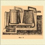 Котлы — чугунные, конической формы, с отъемной крышкой и отверстием внизу (обыкновенные размеры: диаметр вверху 20½ врш., внизу — 13 врш., высота — 20 врш., диаметр нижнего отверстия 2¼ врш., вес 10 пд., вес крышки 3 пд.). Нагревание котлов производится на кустарных заводах самым несовершенным способом. Каждый котел устанавливается на каменном фундаменте с отверстием в центре, на которое наставляется отверстие котла; к центральному каналу в фундаменте точно так же, как при кожуховых печах, подкладывается деревянная труба, расположенная наклонно и по которой продукты перегонки отводятся в приемный чан, поставленный в яме. На фундаменте вокруг котла выводятся стенки высотой до краев котла; промежуток между кирпичной стевкой и стенкой котла представляет топочное и нагревательное пространство; для топки в кирпичной стенке имеется отверстие внизу, для выхода дыма — вверху. Устанавливают также по нескольку котлов (3, 4, 6 и 9) в одном очаге, также самого простого устройства. В этом случае так называемые коренные трубы, т. е. отводные от нескольких котлов (3-6), соединяют с одной общей — выходной трубой.