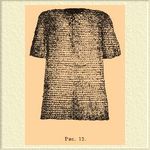 По свидетельству арабского писателя Х-го века Ибн-Даста, у славян князья имели предохранительное вооружение, состоявшее, между прочим, из драгоценных кольчуг. — В княжение Святослава кольчатый Д. и шлем как наголовье входят уже в большое употребление. Они были заимствованы у норманнов. Кольчатых тельных Д. в это время различалось два: панцырь и кольчуга. Пансырем, или панцырем, был Д. в виде рубахи длиною до колен и выше. Он делался из весьма мелких, плотно сплетенных железных колец, а иногда серебряных: у богатых людей он иногда покрывался бархатом. Он мог быть с воротником (ожерельем) или без воротника. На груди, спине и подоле впоследствии иногда помещали круглые металлические бляхи, или мишени. Кольчуга, или колчюга, — Д. подобный панцырю, но кольца ее крупнее, а потому и плетение реже. — С начала ХIII-го столетия, с появлением татар, последние вносят к нам и свои Д. Шлем заменяется милоркой, ерихонкой, шишаком или колпаком, а на кольчуге начинают закреплять металлические доски, переходя таким образом к типу восточных Д. Таким образом явились байданы, бахтерцы, калантари и куяки. Байдана (рис. 12), от арабского бадан — короткая кольчуга, с плоскими кольцами. Если этот Д. был короче колен, то назывался полубайданой.