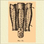 1) Бармица (рис. 14) — оплечье из сплошного железа или из нескольких скрепленных между собою кольцами частей. 2) Зарукавья — металлические пластины, набранные на тесьме, сукне или бархате. Нижняя часть зарукавья называлась запястьем, а верхняя — чашкою. 3) Наколенники — несколько соединенных между собою металлических пластин. Наручи — металлические выгнутые доски, закрывавшие руку от кисти до локтя. Верхняя часть, у кисти руки, называлась запястьем, а нижняя, более длинная — локотником, заходившим за локоть. Рукавицы, делавшиеся из кожи, покрывались металлической сетью или бляхами. Поножи, бутурлыки или батарлыки (рис. 15) служили для защиты ног.