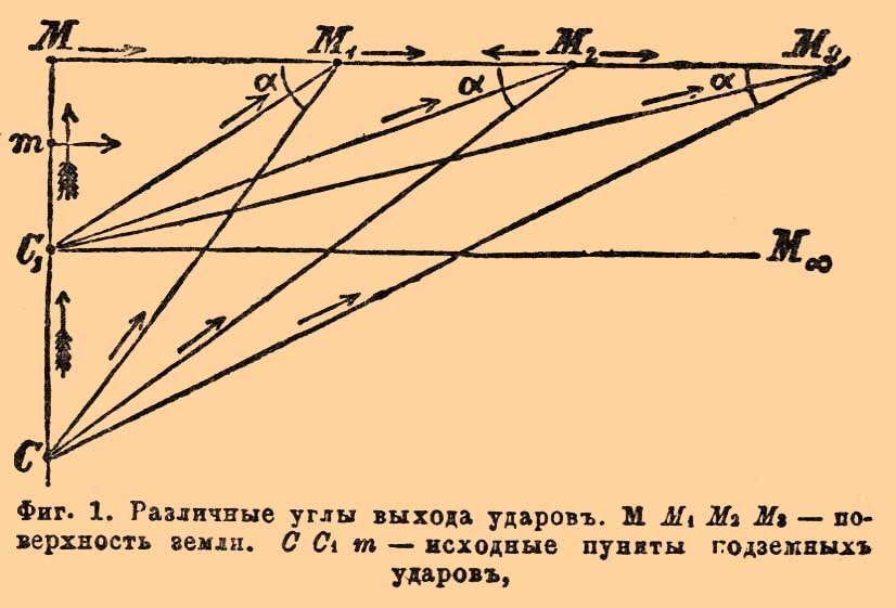 Фиг. 1. Различные углы выхода ударов. M M1 M2 M3 — поверхность земли, C C1 m — исходные пункты подземных ударов.