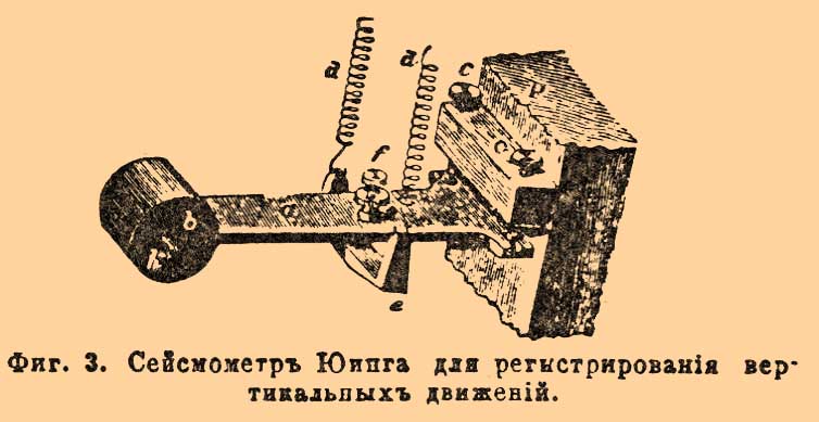Наблюдение и изучение элементов З., начавшееся в Италии и Японии, в последнее время значительно развилось благодаря изобретению целого ряда инструментов, служащих для отметки момента наступления З., для регистрации различных его проявлений, интенсивности и т. п. Учреждение сейсмологических станций после Италии и Японии также и в других странах сильно способствовало развитию науки о З., получившей название сейсмологии, а Росси первоначально названной Ме teorologia endogena. После верненского З. и в России по инициативе Мушкетова приступлено географическим обществом к организации сети станций в пяти сейсмических областях России: Туркестане, Кавказе, Алтае, Забайкалье и Камчатке (незначительные З. Крымского полуо-ва относятся к категории нептуническах и потому гораздо менее заслуживают подробного изучения). Различные инструменты для наблюдений над З. носят название сейсмометров (фиг. 3 и табл.).