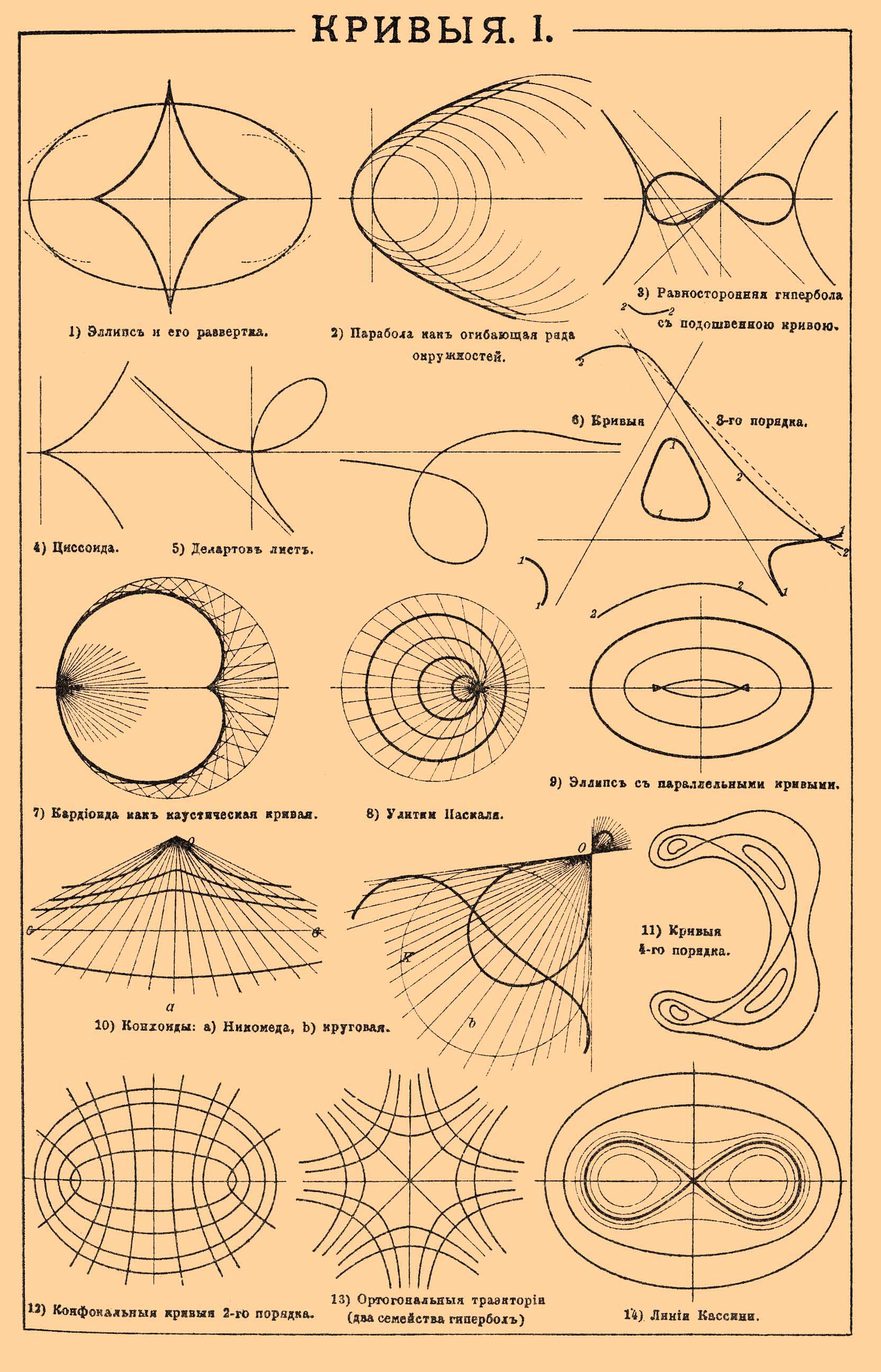 1) Эллипс и его развертка. 2) Парабола как огибающая ряда окружностей. 3) Равносторонняя гипербола с подошвенной кривой. 4) Циссоида. 5) Декартов лист. 6) Кривые 3-го порядка. 7) Кардиоида как каустическая кривая. 8) Улитки Паскаля. 9) Эллипс с параллельными кривыми. 10) Конхоиды: a) Никомеда, b) круговая. 11) Кривые 4-го порядка. 12) Конфокальные кривые 2-го порядка. 13) Ортогональные траектории (два семейства гипербол). 14) Линии Кассини.