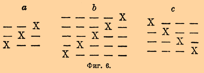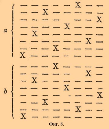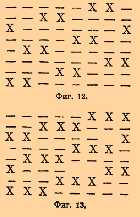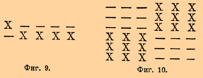 При неимении под рукой клетчатой бумаги способы П. записываются столбцами, в которых горизонтальные строчки обозначают уточные нити, а вертикальные колонны — основные. Уточные перекрытия обозначаются знаком (—), основные крестом или буквами Х или О. Так, предыдущее (фиг. 1 и 2) П. изображается, как показано на фиг. 3.