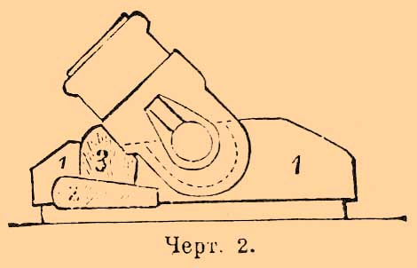 Когда казенная часть оружия приходилась над серединою лафета, то винт, по длине достаточный для придания орудию необходимых углов склонения, будучи весь ввинчен в матку, не упирался в землю; если же казна орудия приходилась над хоботовою частью лафета (черт. 4), то винт делали двойным: наружный винт (1) ходит в матке (2) связной или накладной подушки (3) и в то же время сам служит маткой внутреннего (4) винта с головкой и рукояткой.