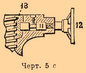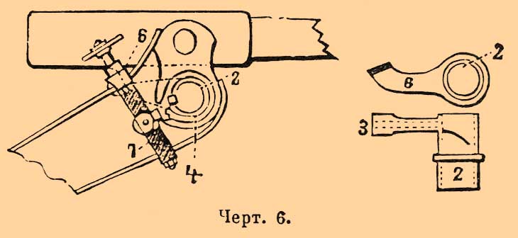 Матка (5) — бронзовая (в легких лафетах) или стальная с навинтованным отверстием для П. винта — снабжена двумя цапфами (9), упирающимися в подшипники (10), приклепанные к станинам лафета; благодаря поворачиванию матки на цапфах, головка винта при действии П. механ. описывает окружность, радиуса = длине вилы, а весь винт качается, следуя за поворотом матки. Чтобы устранить сдачу П. механизма, делается следующее приспособление (черт. 5, b и с): через правую станину и навинтованный канал в правой цапфе (9) матки проходит зажимной винт (11) с маховичком (12); конец винта упирается в стальную плашку (13), прикасающуюся к наружному винту; после наводки орудия, действуя на маховичок через посредство плашки, зажимают наружный винт в матке. Если орудию с перевесом казны приходится придавать настолько большие углы возвышения, что казенная часть значительно опускается между станинами, то к лафету приспособляют боковой качающийся П. механизм (черт. 6); он устроен так: на цилиндрическую лопасть боевой оси (1) надета муфта (2) с рычагом (3), подпирающим казну орудия: на конец этой муфты, выходящий наружу правой станины, наглухо нагнана обойма (4) с вилкой (5), между лапками которой вращается на цапфах матка; у верхнего ребра станины помещена вращающаяся на оси (перпендикулярной к плоскости станины) обойма (6), охватывающая гладкую шейку П. винта (7) с маховичком — таким образом винт может вращаться в обойме и качаться в плоскости, параллельной станине, не имея продольного перемещения; нижний конец винта проходит через матку.