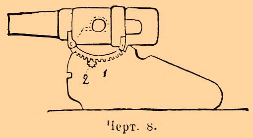 Матка (3) представляет одно целое с маховиком (4); канал ее нарезан только в верхней половине; матка вращается в муфте (5), служащей при посредстве цапфы (6) для соединения П. механизма с лафетом. При вращении маховика винт поднимается или опускается, имея при этом возможность качаться около оси цапфы (6), что необходимо для следования его за движением казны орудия. Клиновые и винтовые механизмы со свободной головкой (не связанной с казенною частью орудия) требуют, чтобы у орудия был перевес казны, иначе при опускании винта или клина казна не последует за ними. Для нарезных, заряжаемых с казны мортир необходим П. механизм, допускающий удобное и весьма быстрое изменение возвышения, потому что для заряжания мортиры приходится каждый раз приводить ее приблизительно в горизонтальное положение, а затем снова придавать прежний угол, обыкновенно весьма значительный. Такому требованию удовлетворяют механизмы (черт. 8), состоящие из зубчатой дуги (1), прикрепленной к орудию так, что центр ее находится на оси цапф, шестерни (2), закрепленной на оси, проходящей через станины лафета и приводимой во вращение от руки или при посредстве передаточного механизма (зубчатая передача), уменьшающего усилие, прилагаемое для приведения в действие Π механизма.