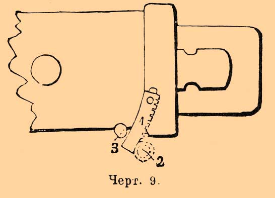 Длинным береговым орудиям, стреляющим обыкновенно прицельно, не приходится придавать больших углов возвышения, почему к казенной части орудия прикрепляется (черт. 9) короткая зубчатая дуга (1) с центром на оси цапф, перемещающаяся между шестерней (2) и направляющим роликом (3); винтовой механизм здесь не может иметь места ввиду громадного веса орудий.