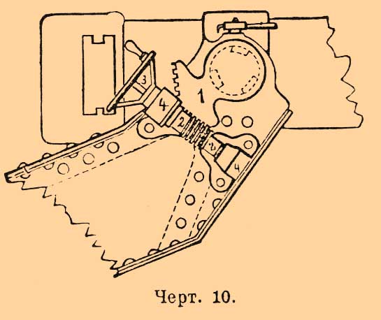 Одно из видоизменений зубчатого механизма состоит в том, что к правой цапфе (черт. 10) приделан зубчатый сектор (1), сцепляющийся с бесконечным винтом (2) верхний и нижний конец которого помещены в обоймах (4), приклепанных к станине; винт приводится во вращение помощью маховика (3) с рукояткой; сравнительно с зубчатыми дугами этот механизм имеет то преимущество, что наводчик, прицеливая орудие, сам изменяет угол возвышения.