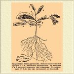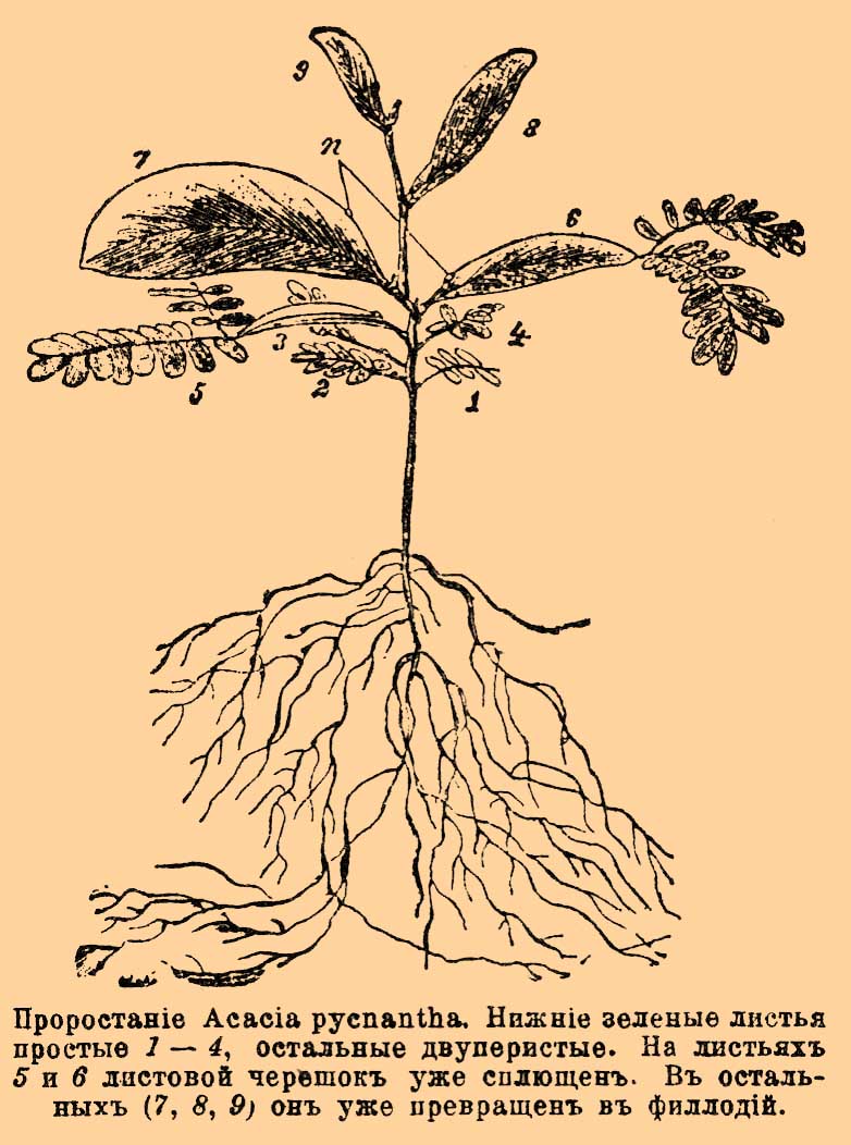 Прорастание Acacia pycnantha. Нижние зеленые листья простые 1 — 4, остальные двуперистые. На листьях 5 и 6 листовой черешок уже сплющен. В остальных (7, 8, 9) он уже превращен в филлодий.