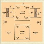 В цилиндре С мы имеем поршень D и перепонку ab, которая проницаема только для хлора. С помощью поршня D и полупроницаемой перепонки ab мы можем ввести в пространство А желаемое количество хлора. Подобным же образом затем мы введем и водяной пар, тогда как кислород и хлористый водород выведем из этого пространства, пользуясь цилиндром E поршнем F и соответственными полупроницаемыми перепонками. Если газы имеют ту же концентрацию, что и в A, то в А ничего не изменится, если произойдет образование кислорода и хлористого водорода, которые затем будут уведены. Теперь выведенные газы О 2 и НCl при той же температуре обратимым процессом будем сжимать или расширять до тех пор, пока не получим такой концентрации, которая имеет место в В, тогда, по предыдущему, произведем обратное превращение и, наконец, полученные продукты приведем к концентрациям, отвечающим А. Так как этот замкнутый цикл совершился при постоянной температуре, то сумма всех работ равна нулю. Следовательно: