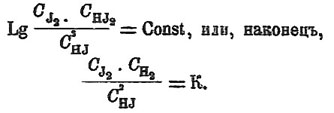 превращение это не идет до конца, так как йод и водород обратно соединяются и дают йодистый водород. Таким образом здесь наступает химическое равновесие, причем в системе одновременно существуют все три тела. Предел этого превращения при постоянной температуре должен зависеть от действующих масс или концентраций этих тел. Применяя к этому случаю общее уравнение равновесия, получим: