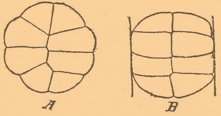 Фиг. 2. Ненормально дробящиеся яйца лягушки. А — между двумя горизонтальными стеклянными пластинками (при рассматривании сверху); В — сдавленные в стеклянной трубочке (по О. Гертвигу из Берга).
