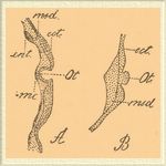 Затем, литиевые растворы вызывают получение экзогаструл, т. е. гаструл с вывороченным наружу кишечником, имеющих громадное значение для понимания процесса гаструляции (см. Экзогаструла). Аналогичное выпячиванию наружу кишечника явление наблюдается при выворачивании наружу нервной трубки цыпленка при убавлении белка (см. Экзонейрула). Точно так же хлористый литий, вызывающий выпячивание кишечника, оказывает то же действие и при развитии других органов. Так, слуховые пузырьки головоногих нормально появляются в виде полого эктодермического углубления (фиг. 3, А), а на одном зародыше, развивавшемся в растворе хлористого лития, этот пузырек выпятился наружу и представлялся в виде плотно сидящего на стебельке бугорка (фиг. 3, В).