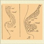 Но рост эктодермы идет лишь в одном направлении — кверху, где и образуется кругом яйца валик из эктодермы, иногда со складчатыми стенками. Глубже лежащие слои зародыша не представляют такого явления. Таким образом, клетки эктодермы, встречая препятствие и попадая в углубления желтка, где они находят условия усиленного питания, разрастаются и переходят к одностороннему телобластическому росту. Если вспомним, что, например, мезодермические телобласты у личинок лежат в задней части тела, где они, с одной стороны, встречают препятствие со стороны задней стенки зародыша и в то же время иногда и наилучшие условия питания, ибо всасывание пищи у личинок, вероятно, энергичнее происходит в задней части кишечника, то обнаружим некоторое сходство в условиях, в которых находятся телобласты личинки и краевые клетки описанного зародыша головоногого моллюска. Нетрудно также видеть, какое громадное значение все-таки имеет природа и состояние клетки: только клетки эктодермы, да и то не во всех стадиях, могут быть переведены к телобластическому росту, а прочие клетки, а именно мезодермические и прилежащий к желтку слой мероцитов, не представляют нам ничего подобного (Шимкевич, 1900). У цыпленка введением растворов в белок можно вызвать, кроме указанных изменений, целый ряд своеобразных уклонений: остановку роста зародышевого диска, подавление развития аллантоиса и амниона, а равно развитие последнего в отсутствие зародыша, изменение в расположении сосудов сосудистого поля, задержку замыкания бластопора, образование карликов, подавление развития конечности (см. Эктромелия), расщепление нервной трубки, задержку ее замыкания, экзонейрулы (см.), омфалоцефалию, или подгибание переднего конца нервной трубки к пупку, недоразвитие органов чувств, чрезвычайное развитие первичной полости, расширение полостей сомитов и целома, смещение (эктопию) сердца, водянку (гидропсию) сосудов, а равно и многие другие уклонения (Шимкевич, 1902). Интересны опыты Гербста (1903) над развитием яиц морских ежей в морской воде, лишенной той или другой из своих составных частей. Таким образом, по наблюдаемым уклонениям можно судить о том, какова роль той или другой составной части. Так, присутствие калия необходимо для роста зародыша, и в его отсутствие получаются маленькие бластулы, не образующие зачатка кишечника. Соли кальция необходимы для склеивания клеток зародыша, и в отсутствие этих солей бластомеры яйца расходятся, образуя неправильную кучку. Сульфаты также необходимы для роста, и их отсутствие вызывает гипертрофию ресничного пучка. Щелочной характер необходим для движения ресничек. В отсутствие хлоридов дробление начинается, но потом останавливается и т. п. Личинки морских ежей (Pluteus) снабжены отростками, в которых залегают известковые палочки скелета (фиг. 8, А).