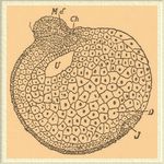 На эти-то формы и опираются Ру и Вейсман (см. Наследственность). По их представлению, каждое деление ядра и яйцевой клетки, несмотря на видимое тождество дочерних ядер и клеток, заключает в себе неодинаковое распределение тех или других наследственных свойств между дочерними клетками. При первом делении шар правый получает способность воспроизводить лишь органы правой стороны, а шар левый — левой. То же происходит и далее. Данная клетка делается нервной или печеночной потому, что она получила в ядре элементы (детерминанты), определяющие ее свойства как таковой, и никакой другой эта клетка не может сделаться. Половые клетки сохраняют все первоначальные свойства в совокупности, но иногда и клетки соматические, если животное способно, напр., регенерировать органы, давать почки и т. п., сохраняют все или часть свойств половых клеток. Такое распределение наследственных свойств по мере деления яйца напоминает работу мозаиста, укладывающего по камешку в отдельные части общего рисунка, а самая гипотеза получила название "Mosaiktheorie" (см. Наследственность). Однако имеются и другие факты, когда даже 1/3 часть яйца, т. е. одна из 8 бластомер, дает целое животное. Опираясь на эти факты, Гертвиг и Дриш защищают положение, что никакой существенной дифференцировки наследственных свойств при дроблении не происходит. Все клетки организма тождественны по природе, и если одна клетка делается такой, а другая — иной, то не потому, что они получают определяющие их элементы, гипотетические детерминанты, а в зависимости от условий, в которые они попали. Однако приведенные выше опыты не дают еще права сделать вышеуказанное заключение. Единственный вывод, который мы можем на основании их сделать, это то, что если происходит предполагаемая дифференцировка наследственных свойств при дроблении, то у одних форм она начинается раньше, у других позже, и вообще довольно близкие формы (лягушка и тритон наприм.) могут в этом отношении представлять различие. У одних форм такая дифференцировка начинается с первого деления, а у других и в стадии 8-и шаров все они — идентичны. Мало того, у одного и того же животного получаются то частичные зародыши, то цельные, смотря по способу удаления части яйца. Если у тритона половинную бластомеру удалить совсем, то оставшаяся округляется и дает цельного зародыша. Если одну бластомеру убить накаленной иглой и оставить на месте, то другая дает половинного зародыша. Самое замечательное в этом отношении наблюдение Дриша, который утверждает, что у морских ежей как верхний этаж из 4-х шаров в стадии деления на 8, так и нижний дают целого зародыша, т. е. оба этажа заключают в себе зачатки экто- и энтодермы. Это было подтверждено Гербстом (1900), по словам которого верхняя (анимальная) часть 16-клеточной стадии дает нормальную гаструлу и притом чаще, чем нижняя (вегетативная) часть. Последняя дает рядом с нормальными такие гаструлы, в которых не развивается мезенхима или даже развитие не идет дальше бластулы. Вообще, надо принять, что клетки зародыша, а иногда и взрослого обладают способностью воспроизводить не только те органы и части, которые они производят при нормальном ходе развития, но и соседние. Эта способность, называемая перспективной (Prospective Potenz), сказывается и при регенерации в зародышевом состоянии, причем выясняется, что специализаци