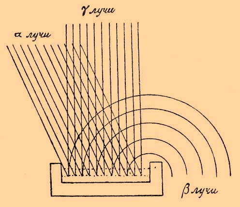 Прилагаемый рисунок изображает направление лучей в магнитном поле, причем северный полюс магнита надо представить себе расположенным перед плоскостью рисунка, а южный позади. На рисунке видно, что α-лучи отклоняются в ту сторону, куда отклонился бы в этом магнитном поле проводник с током, если бы ток шел в сторону распространения α-лучей, т. е. вверх. Отклонение β-лучей происходит в сторону, противоположную α-лучам. В сторону отклонения β-лучей проводник с током отклонился бы, если бы ток шел по направлению, противоположному β-лучам, т. е. сверху вниз. По своему отклонению в магнитном поле α-лучи похожи на "закатодные" лучи (Kanalstrahlen), β-лучи похожи на катодные, а γ-лучи на лучи Рентгена. Таким образом, в препарате бромистого радия мы имеем как бы Круксову трубку, в которой возможно наблюдать все эти лучи. Действительно, при пропускании тока через Круксову трубку, в ней наблюдается пучок света, распространяющийся из катода прямолинейно и вызывающий на стеклянной стенке трубки в том месте, где он падает, фосфоресценцию. Направление пучка света в этой трубке показывает направление особого рода лучей, так наз. "катодных" (пучок света не есть катодные лучи — это свечение воздуха под влиянием катодных лучей). Катодные лучи отклоняются в магнитном поле, причем их отклонение происходит, как и отклонение β-лучей, в ту сторону, куда отклонился бы подвижный проводник, по которому ток шел бы по прямо противоположному этим лучам направлению. Катодные лучи точно так же испытывают на себе действие и электрического поля: они притягиваются пластинкой, заряженной положительно, и отталкиваются пластинкой, заряженной отрицательно. Заставляя катодные лучи падать на какое-нибудь тело, можно показать, что тело заряжается отрицательно. Из этого следует, что катодные лучи представляют из себя частички, несущие отрицательный заряд. Пользуясь явлениями отклонения в магнитном поле, а также и в электрическом, возможно определить как массу частицы, так и её скорость. Эта определения показали, что массы частицы катодных лучей почти в 2000 раз менее массы атома водорода (точнее в 1800 раз), скорость же её около ⅓ скорости света. Таким образом, частица в катодном луче — не атом, а часть атома и при том обладает определенным отрицательным зарядом, вследствие чего она получила название электрона (см. Электрон и Электронная теория). В Круксовой трубке, в которой катодная пластинка в нескольких местах просверлена, можно наблюдать еще особые лучи: "закатодные" или Kanalstrahlen. Эти лучи, наблюдаемые по другую сторону катодной пластинки (почему и названы "закатодные"), как показали опыты, состоят из частиц, заряженных положительно: падая на тело, помещенное на их пути, эти лучи заряжают его положительным электричеством; отклонение этих лучей в магнитном поле происходит в сторону, противоположную отклонению катодных лучей. Масса частицы закатодного луча оказалась близкой к массе того газа, который был в Круксовой трубке, скорость же движения частицы около 1/3000 скорости света. В пространстве, окружающем Круксову трубку, мы имеем лучи Рентгена. Рентгеновские лучи являются результатом ударов электронов о стенку трубки. Определения массы и скорости движения для частиц α-лучей и β-лучей радия дали для α-лучей те же числа, что и для закатодных, а для β-лучей те же, что для катодных. Кроме т
