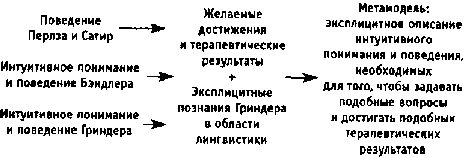 Гриндер и Бэндлер сумели создать метамодель (1975), в которой синтезировали а) свое интуитивное понимание вербальных способностей Перлза и Сатир, б) непосредственные наблюдения (как в жизни, так и с помощью видеозаписи) за работой этих выдающихся психотерапевтов, и в) эксплицитные познания Гриндера в области лингвистики (особенно в трансформационной грамматике) (рис. 12).