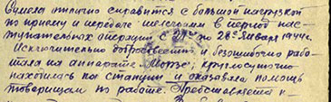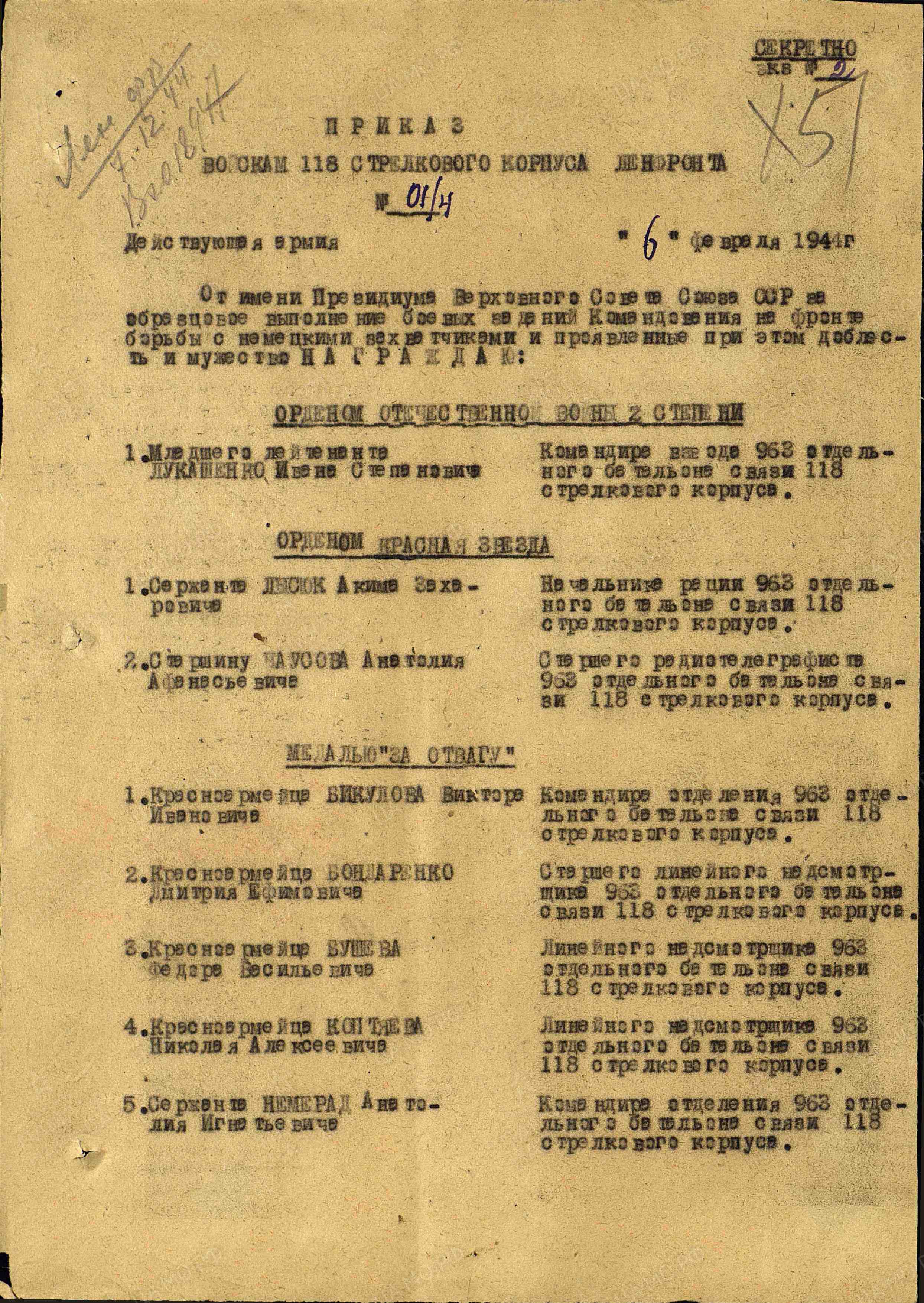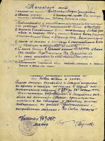 В мае 1942 г. Лидия Андреева была призвана в армию. Ее воинское звание – красноармеец. Служила в 963 отдельном батальоне связи 118 стрелкового корпуса Ленинградского фронта. В феврале 1944 г. была награждена медалью «За боевые заслуги». Из приказа: «…сумела отлично справиться с большой нагрузкой по приему и передаче телеграмм в период наступательных операций с 21 по 28 января 1944 г. Исключительно добросовестно и безошибочно работала на аппарате «Морзе», круглосуточно находилась на станции и оказывала помощь товарищам по работе».