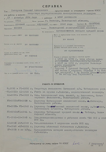 Дмитриев Николай Алексеевич. Личный листок по учёту кадров // ГАВО. Ф. П-1858. Оп. 33. Д. 79. Л. 2-3.