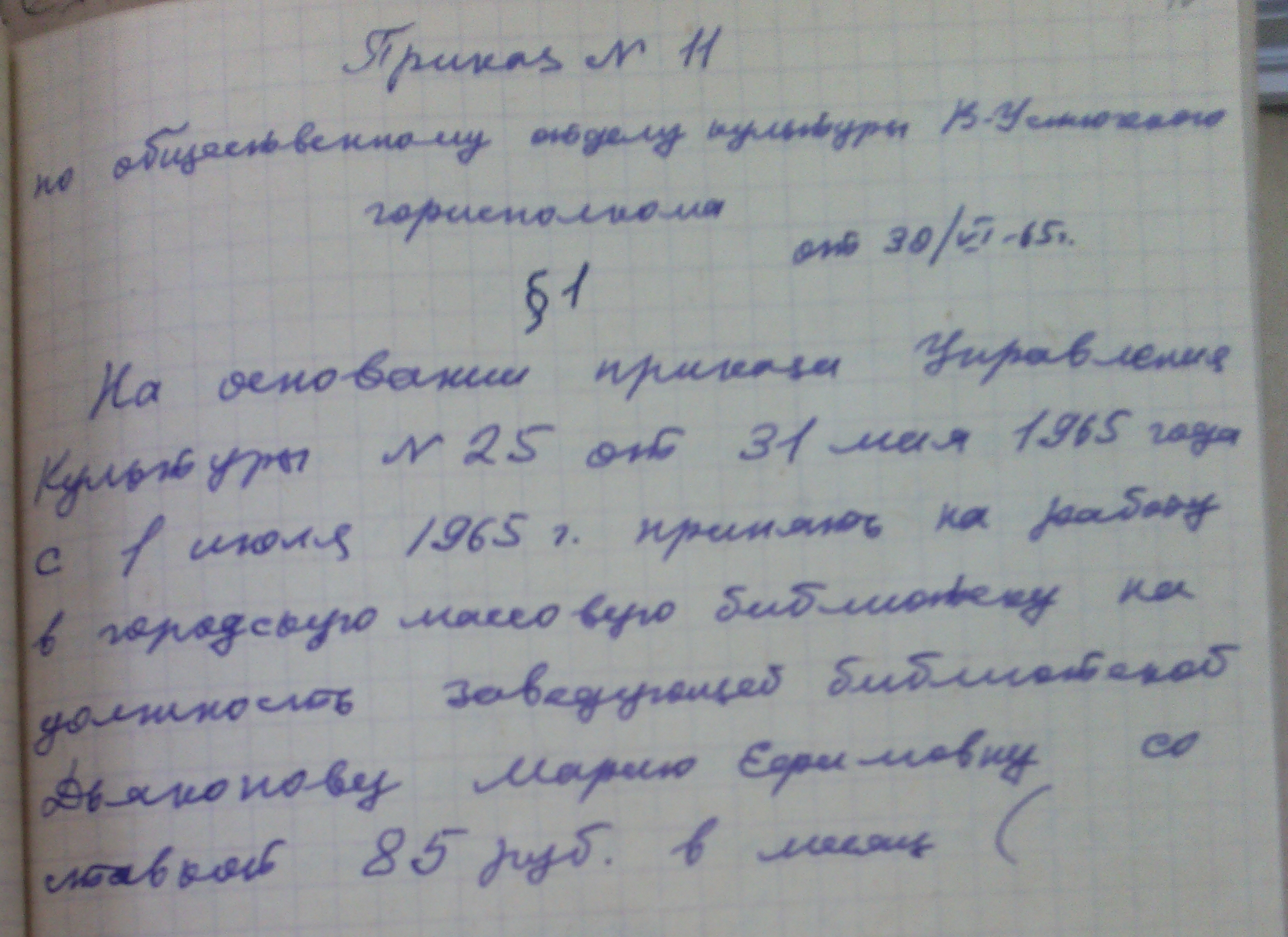 Дьяконова Мария Ефимовна : приказ №11 §1 от 30.06.1965 года о приеме на работу зав. городской библиотекой // Великоустюгский центральный архив. Ф. 11. Оп. 2. Д. 1. Л. 10.