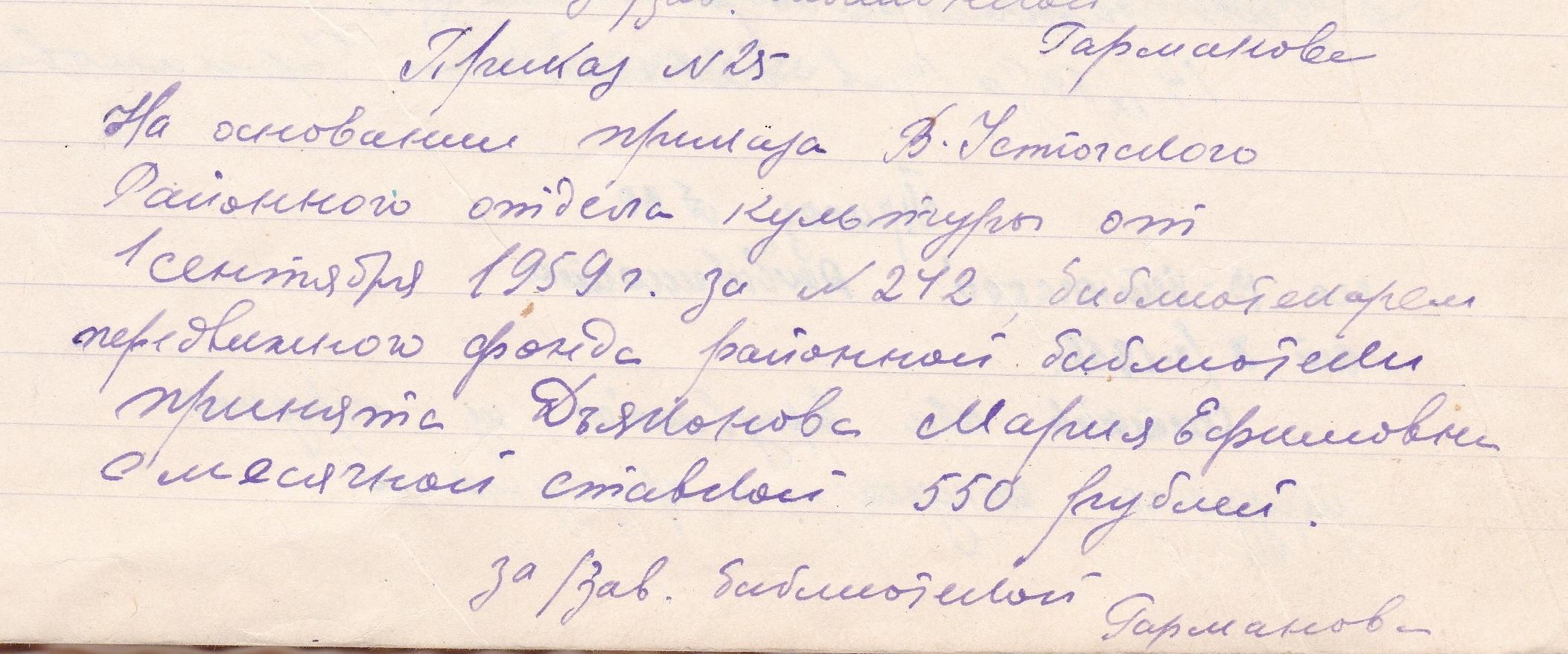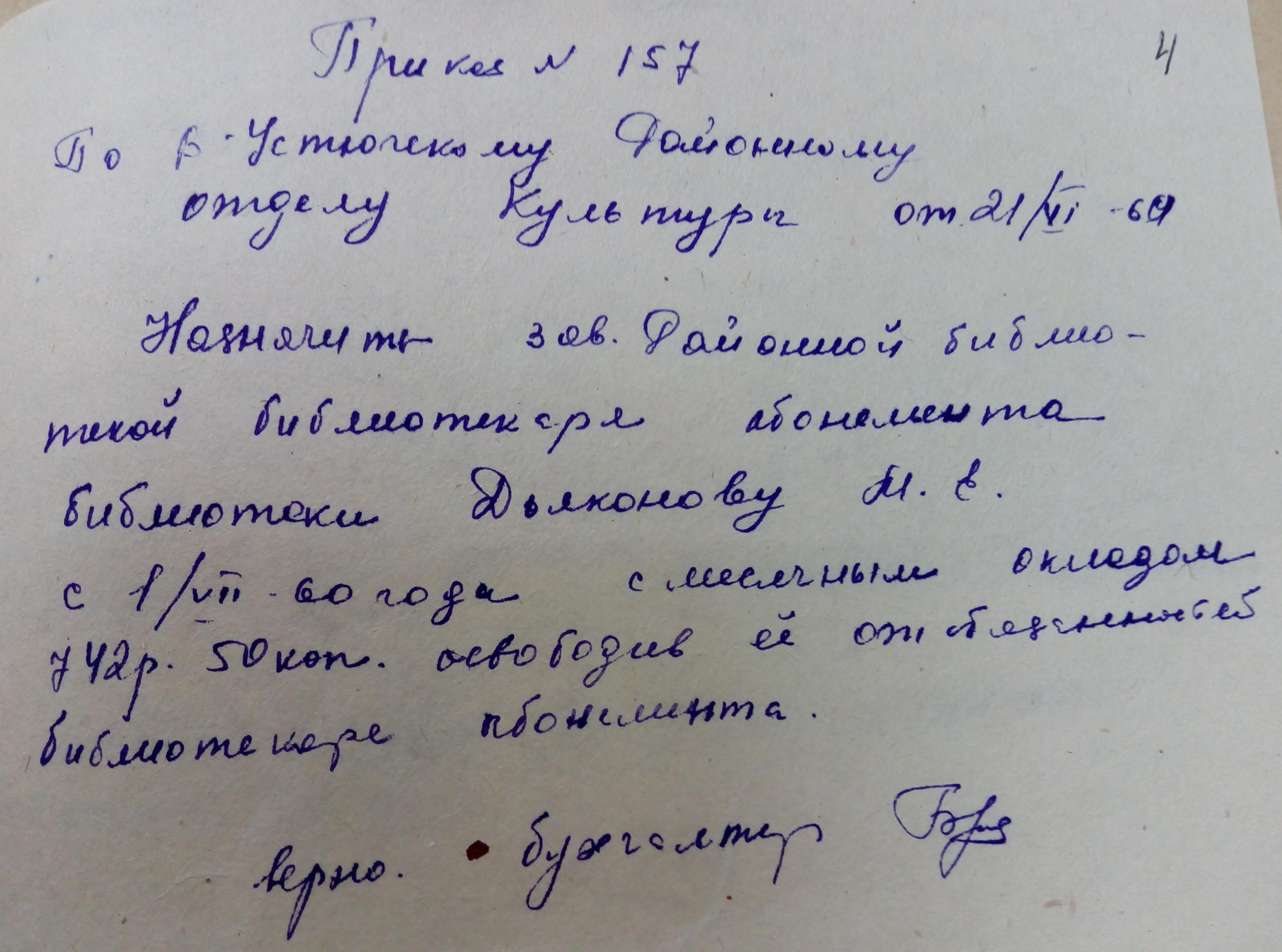 Дьяконова Мария Ефимовна : приказ № 157 от 21.06.1960 года о назначении зав. районной библиотекой // Великоустюгский центральный архив. Ф. 40. Оп. 1. Д. 51. Л. 4.