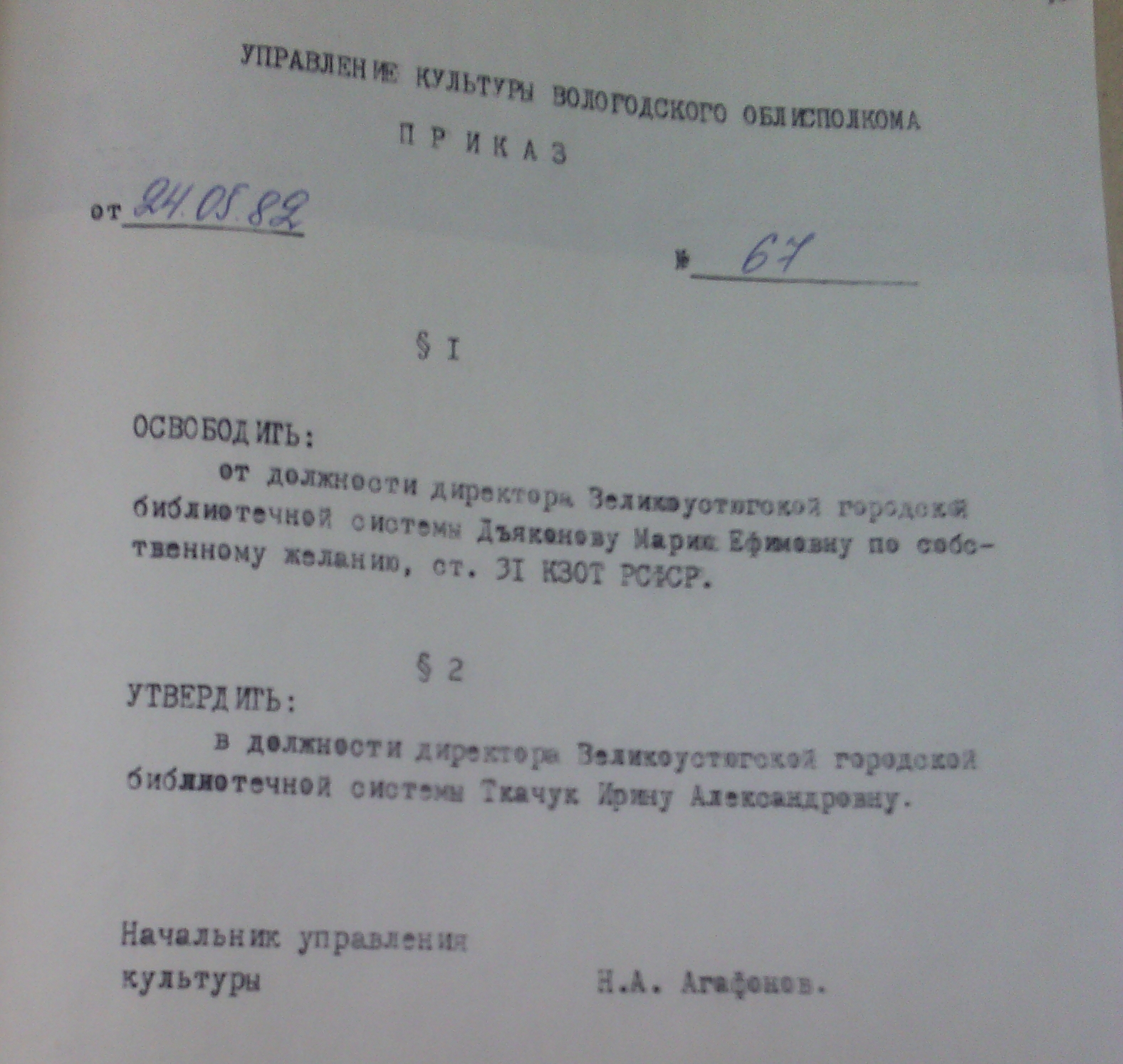 Дьяконова Мария Ефимовна : приказ № 67 §1 от 24.08.1982 об освобождении от должности зав. городской библиотеки по собственному желанию // Великоустюгский центральный архив. Ф. 11. Оп. 2. Д. 79.
