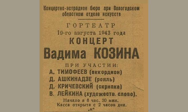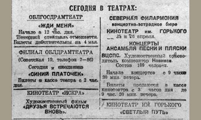 Концерты мастеров искусства // Красный Север. – Вологда, 1944. – 6 августа (№ 155). – С. 1.